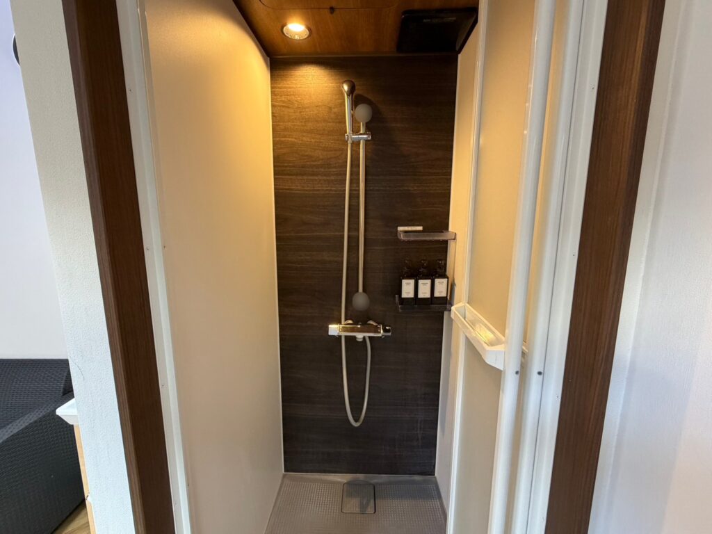 左側が脱衣所になっていて、トレーラーハウス内にしては