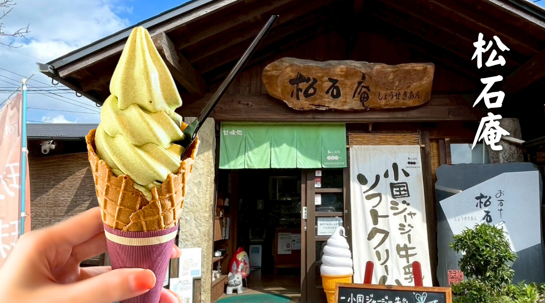 入口に「ソフトクリーム」の看板とメニューが置いてある「松石庵」(しょうせきあん)